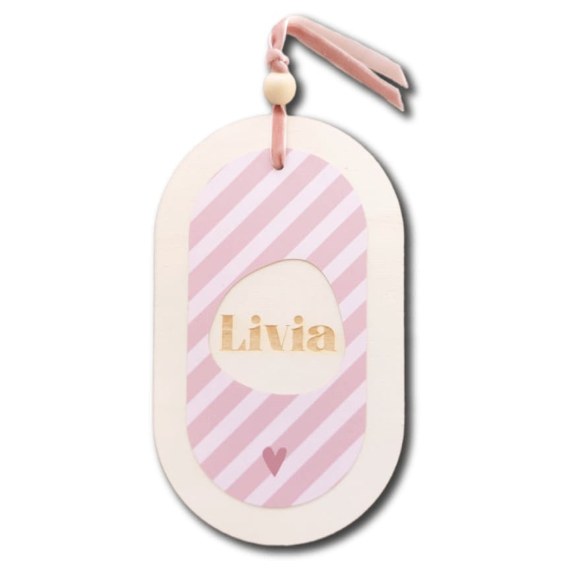 Laat je verrassen door dit geboortekaartje van hout – Ovaal Strepen Meisje. 🌸 Met roze strepen, een lintje naar keuze en een persoonlijke gravure wordt dit kaartje echt uniek.