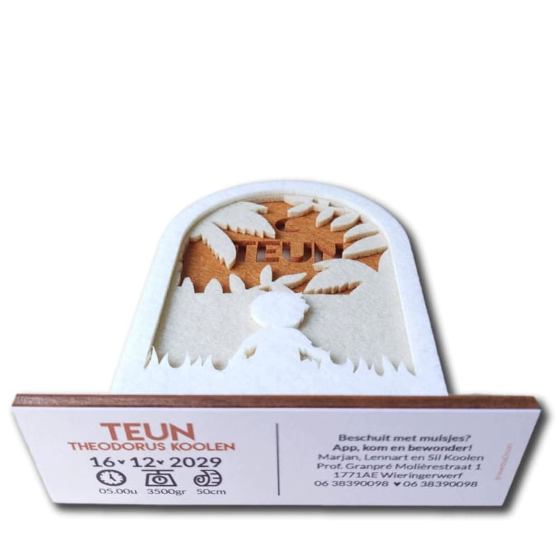 De voet van hout geeft het kaartje stevigheid. Handig, want zo kan de ontvanger het geboortekaartje om neer te zetten. En eerlijk is eerlijk: dit is er eentje die niet snel verdwijnt. 😉