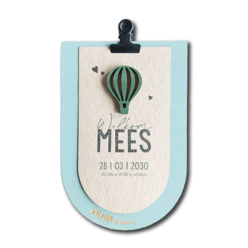 Geboortekaartje hout met klembord en 3D luchtballon - stoer, uniek en met bewaarwaarde