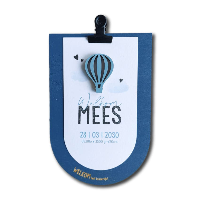 Geboortekaartje van hout - Klembordje Boog Luchtballon Jongen | Prijs vanaf: