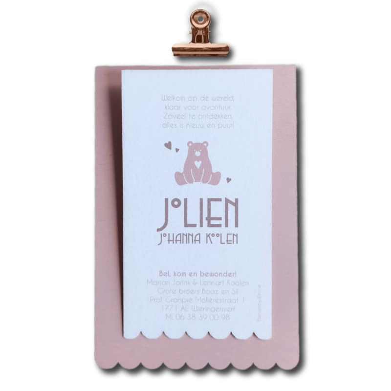 Zacht roze hout. Een lief beertje met hartje. En een speelse schulprand onderaan. Dit geboortekaartje meisje hout is warm, zacht en toch stevig. Een kaartje dat je niet weglegt. Maar bewaart. Perfect als geboortekaartje dochter of geboortekaartje zusje.