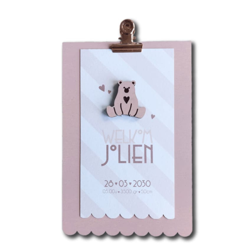 Geboortekaartje van hout - Klembordje Schulprand Beer Meisje | Prijs vanaf: