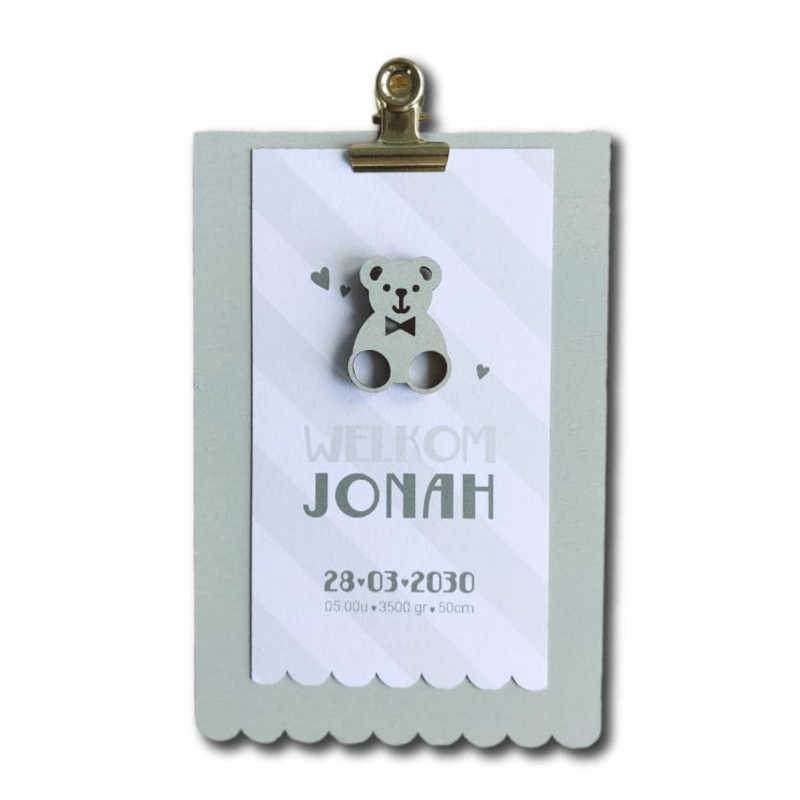 Geboortekaartje van hout - Klembordje Schulprand Beer Jongen | Prijs vanaf: