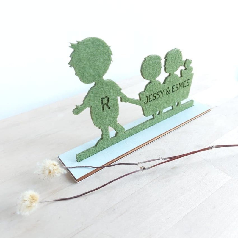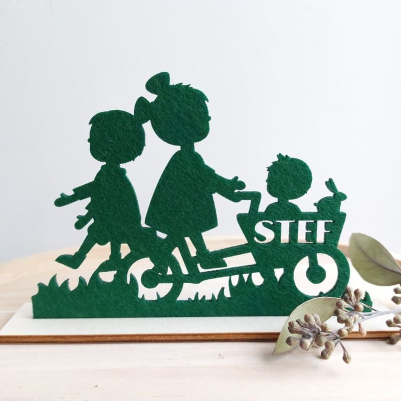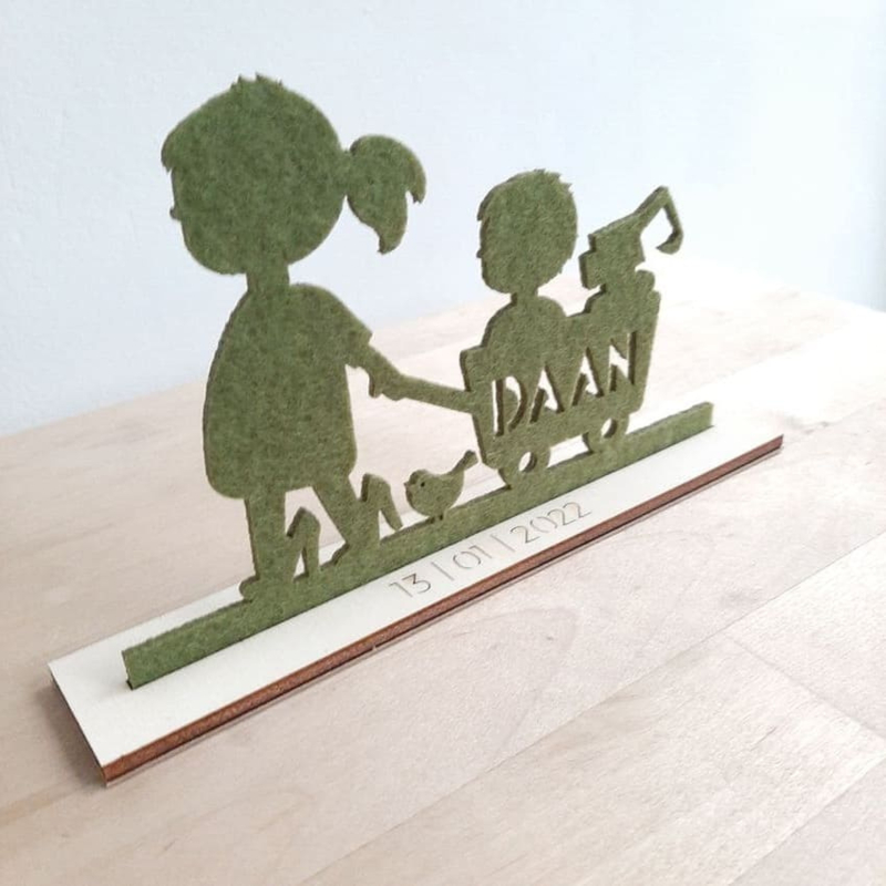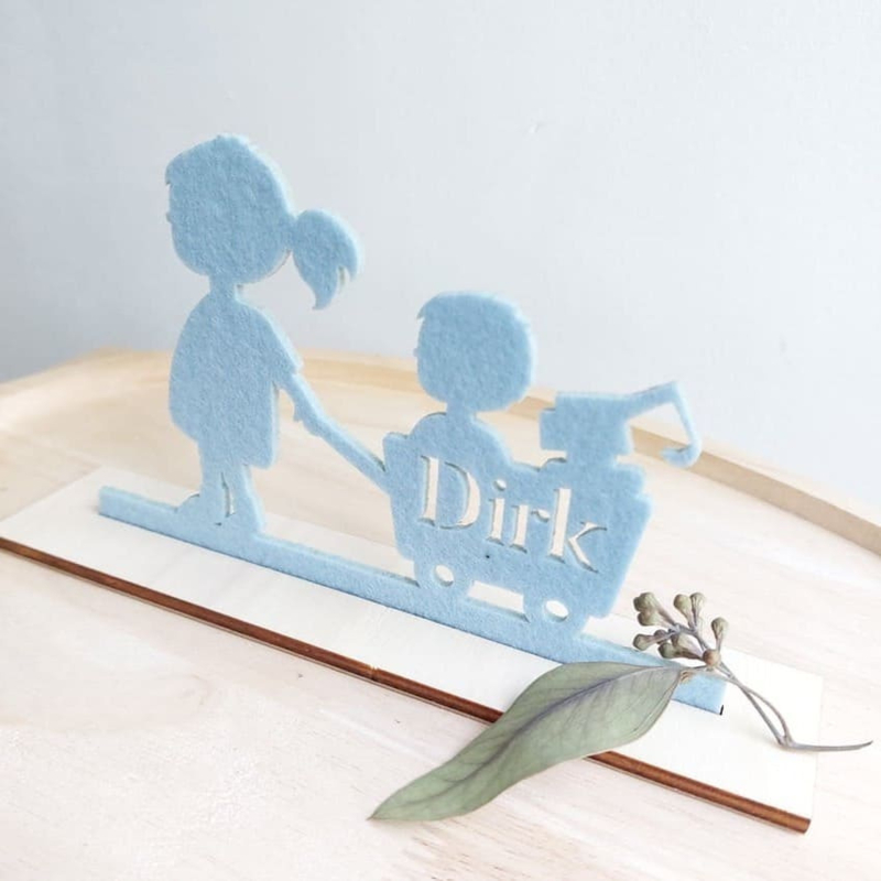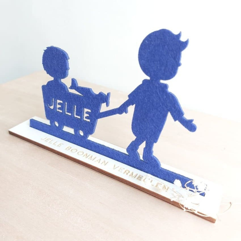 Uniek jongens geboortekaartje van vilt in de vorm van een silhouet van een jongetje met bolderkar, eendje en zeilboot. De naam wordt uit de kar gesneden. Het silhouetje wordt geleverd met een blank houten voet zodat de ontvanger het kaartje mooi neer kan zetten. Aan de onderkant van de voet staat op een kaartje van kraftpapier de overige informatie.