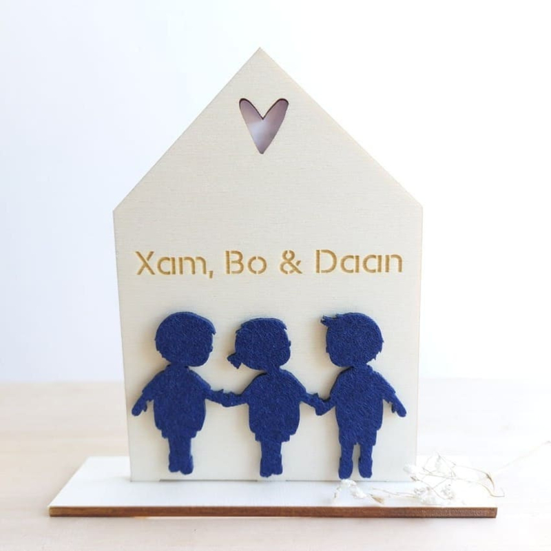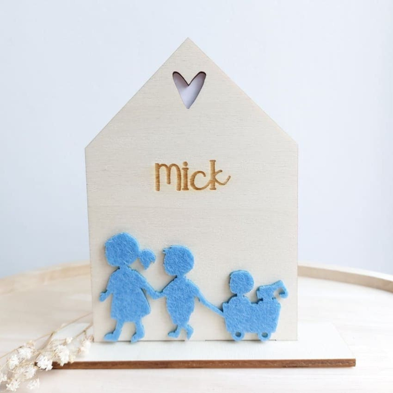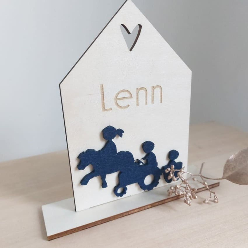 Uniek echt houten jongens geboortekaartje in de vorm van een huisje. Wordt geleverd met gegraveerde naam, vilten silhouet en sterrenbeeld en voetje om het kaartje neer te kunnen zetten.